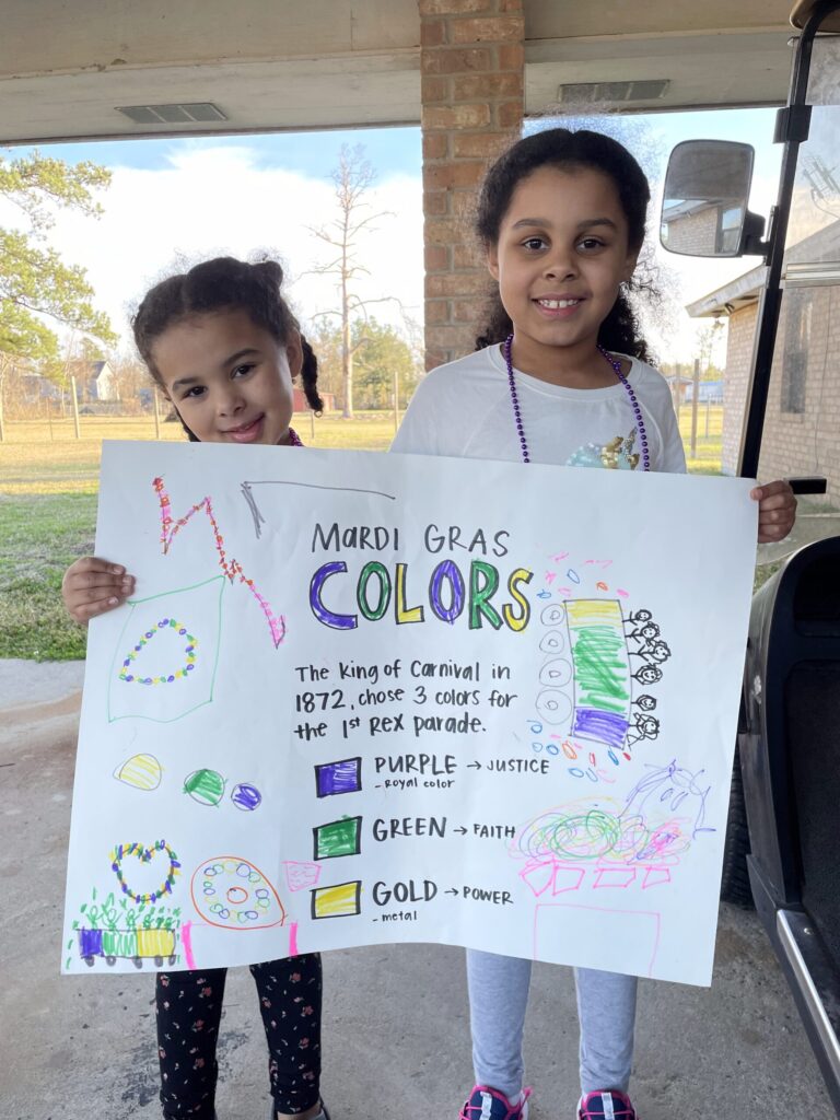 You will probably have to teach younger kids how to pull important information out of what they are reading. Last year my youngest girls both worked on their presentation together (they chose Mardi Gras colors). I read them the material I had pulled from online and then we talked through what the three colors were and what each one meant. I helped them write that on their board and then let them have a good ol’ time coloring and decorating. Before they presented their projects to the family, I helped them go over all the colors again and what they meant. They were so proud (and so were we!)