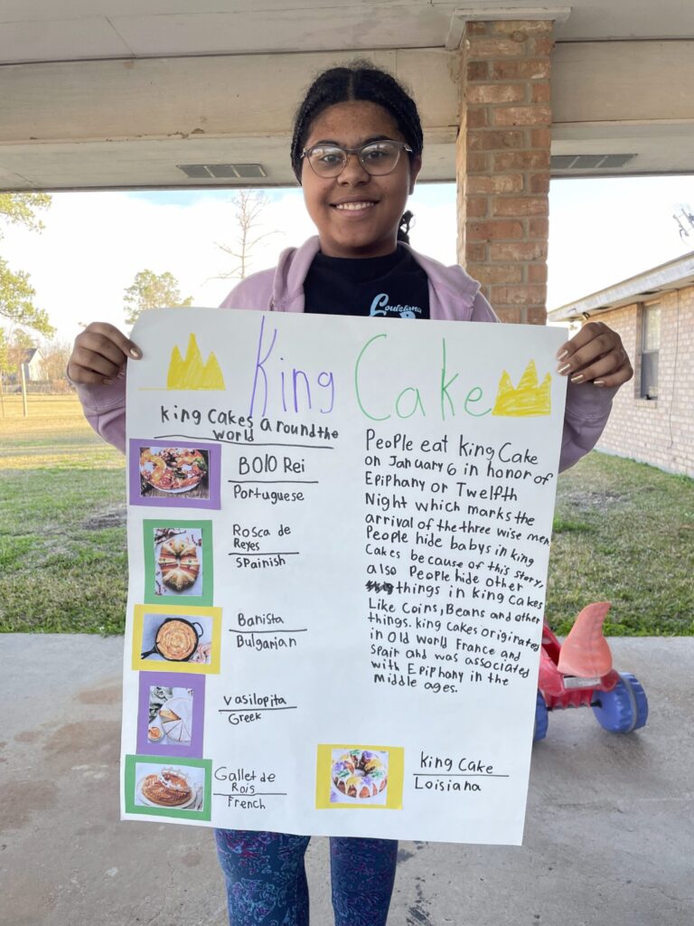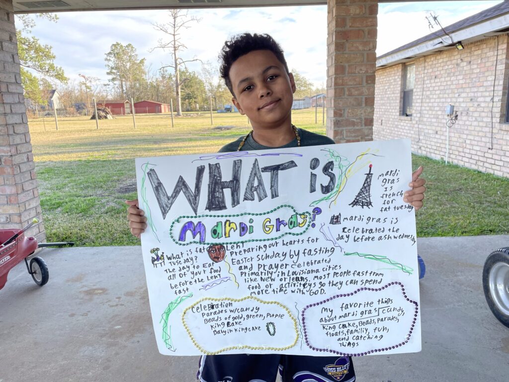 Last year, I had an idea to let my kids research and present their own projects teaching us about different traditions related to the Mardi Gras holiday. It was really fun watching them do the research, and teaching my littlest kids what information was important to share in their projects. They had the most fun decorating their poster boards of course, but they were all proud to show us what they learned!